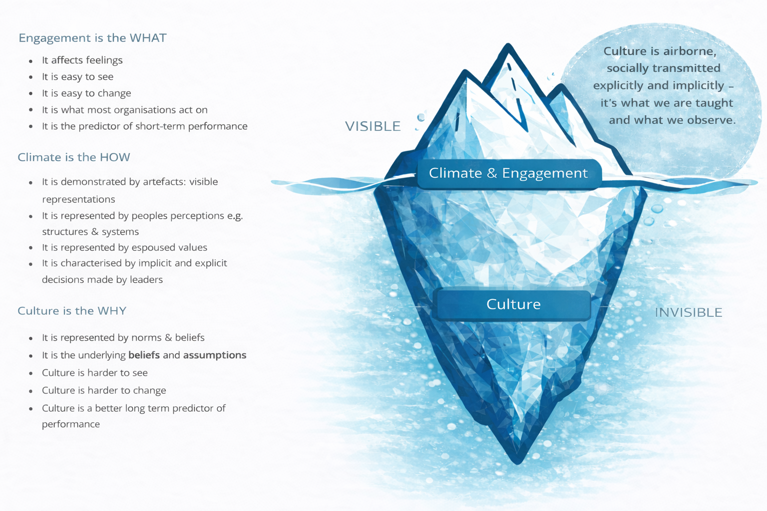 Culture, in contrast, represents the shared norms, beliefs, and expectations that shape behaviour in an organisation — the “why” behind how things get done. It’s grounded in what people believe they must do to fit in and be successful, shaping not just perceptions but actual behaviour over time. Culture is harder to observe and slower to change, but it is a better long-term predictor of organisational performance.